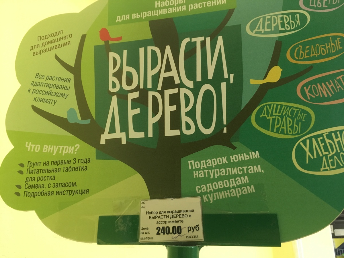Я уже заканчивала эту статью, когда вдруг заметила, что на плакате между словами «вырасти» и «дерево» стоит запятая. На самом деле там написано обращение не к покупателю: «Вырасти дерево!», а к самому дереву: «Вырасти , дерево!»