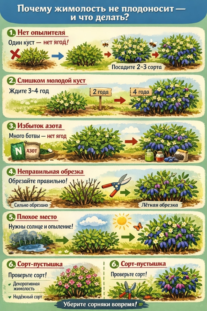 Если жимолость «жирует» — много зелени, но нет плодов — вероятно, перебор с азотными удобрениями (навоз, перегной, аммиачная селитра).