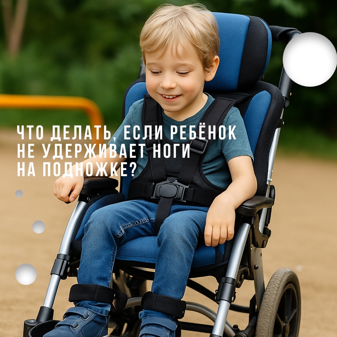 Такая ситуация встречается довольно часто у детей с ДЦП и другими двигательными нарушениями. Важно понимать, что правильное положение ног — это не просто вопрос удобства, а элемент, напрямую влияющий на осанку и устойчивость всего тела. 🔹 Почему это происходит: — сниженный мышечный тонус или слабость в ногах; — повышенный тонус и перекрёст ног (scissoring); — неправильная высота или угол подножки; — отсутствие фиксации стоп. 🔹 Чем это опасно: Если ноги “съезжают” или висят в воздухе, меняется распределение веса — таз уходит вперёд, спина округляется, ребёнок начинает “проваливаться” в сиденье. Со временем это может привести к деформации позвоночника и тазобедренных суставов. 🔹 Что можно сделать: ✅ Проверьте высоту подножки — колени должны быть под углом 90°. ✅ При необходимости добавьте ремешки или мягкие фиксаторы для стоп. ✅ Если ребёнок постоянно скрещивает ноги — обсудите с ортопедом использование абдуктора (разделителя коленей). ✅ При выраженной слабости мышц — возможен вариант
