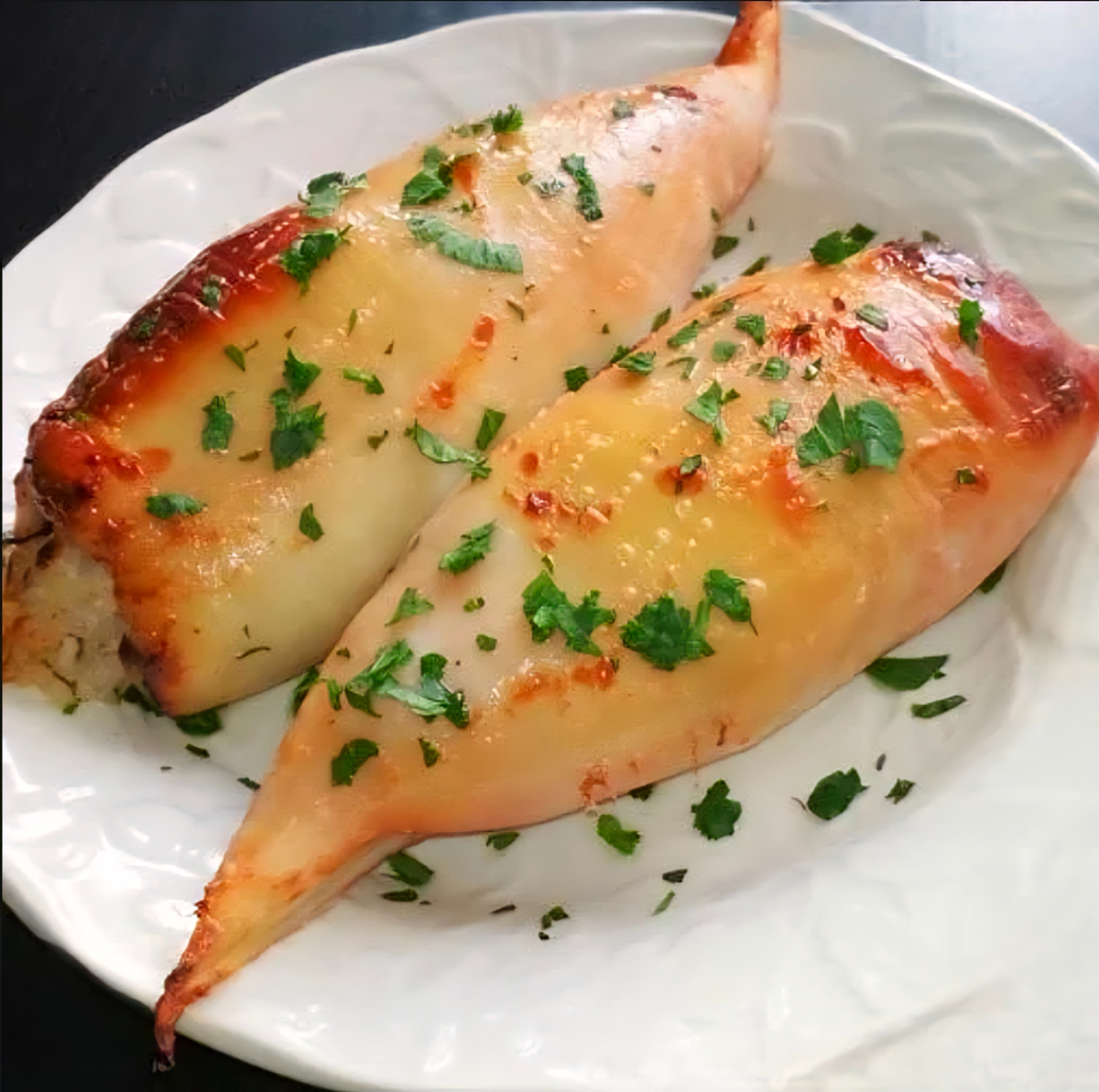 Готовое блюдо выглядит очень аппетитно и эффектно! Сочные кальмары с ароматной грибной начинкой и расплавленным сыром станут настоящим украшением вашего стола. Приятного аппетита! 🍽️