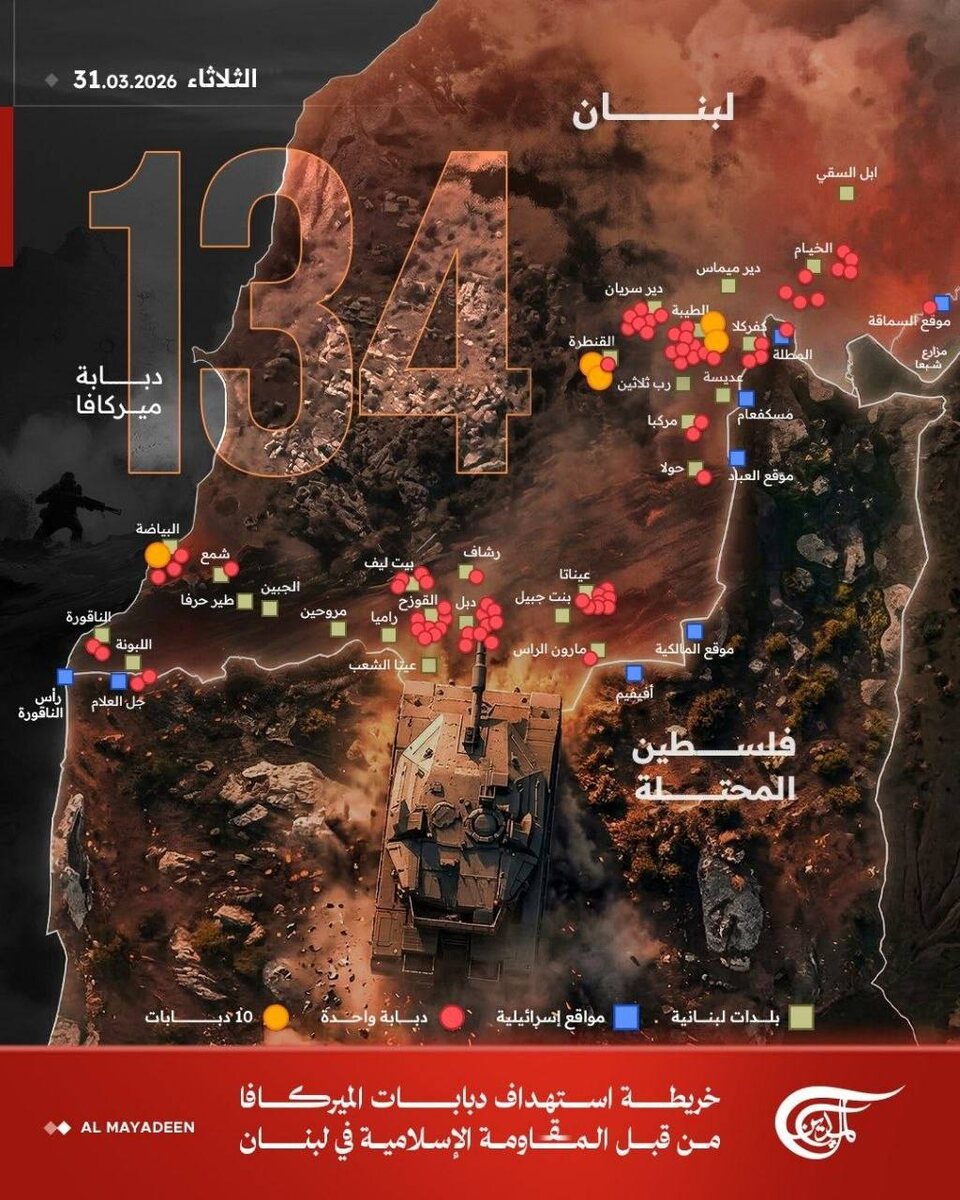 31 марта 2026 года группировка заявила о 134 уничтоженных и повреждённых израильских танках на юге Ливана. Для справки: «Хезболла» — признанная террористическая организация во многих странах.