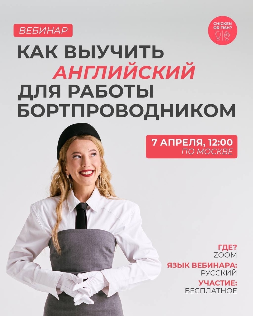 Ты узнаешь? ▪️Какие уровни языка требуют авиакомпании? ▪️За какой срок можно выучить 🇬🇧 для определенного уровня? ▪️Почему у тебя раньше не получилось заговорить на английском? 😨Учишь годами, а в диалоге — ступор. 😨Боишься ошибок и акцента. 😨Нет языковой среды, и негде практиковаться. Разберем каждую причину и дадим решение. ▪️ ⚡️ Какие методы НЕ работают (и на что ты зря тратишь время) И что увеличит твои шансы быстрее заговорить? 📌 Детали вебинара: 📅 Когда: 7 апреля, 12:00 по Москве 🌍 Где: Zoom (ссылку отправим в Telegram-канал в день эфира) Мы в Telegram: https://t.me/chicken_or_fish 💰 Участие: Бесплатное Язык вебинара: русский ✈️ Кому это нужно: ✅ Тем, кто мечтает стать бортпроводником, но боится языкового барьера. ✅ Тем, кто уже пробовал учить английский, но так и не заговорил. ✅ Тем, кто хочет понять реальные требования авиакомпаний к языку (а не слухи из форумов). ✅ Тем, кто готов наконец перестать «откладывать на потом» и сделать первый шаг к работе мечты.