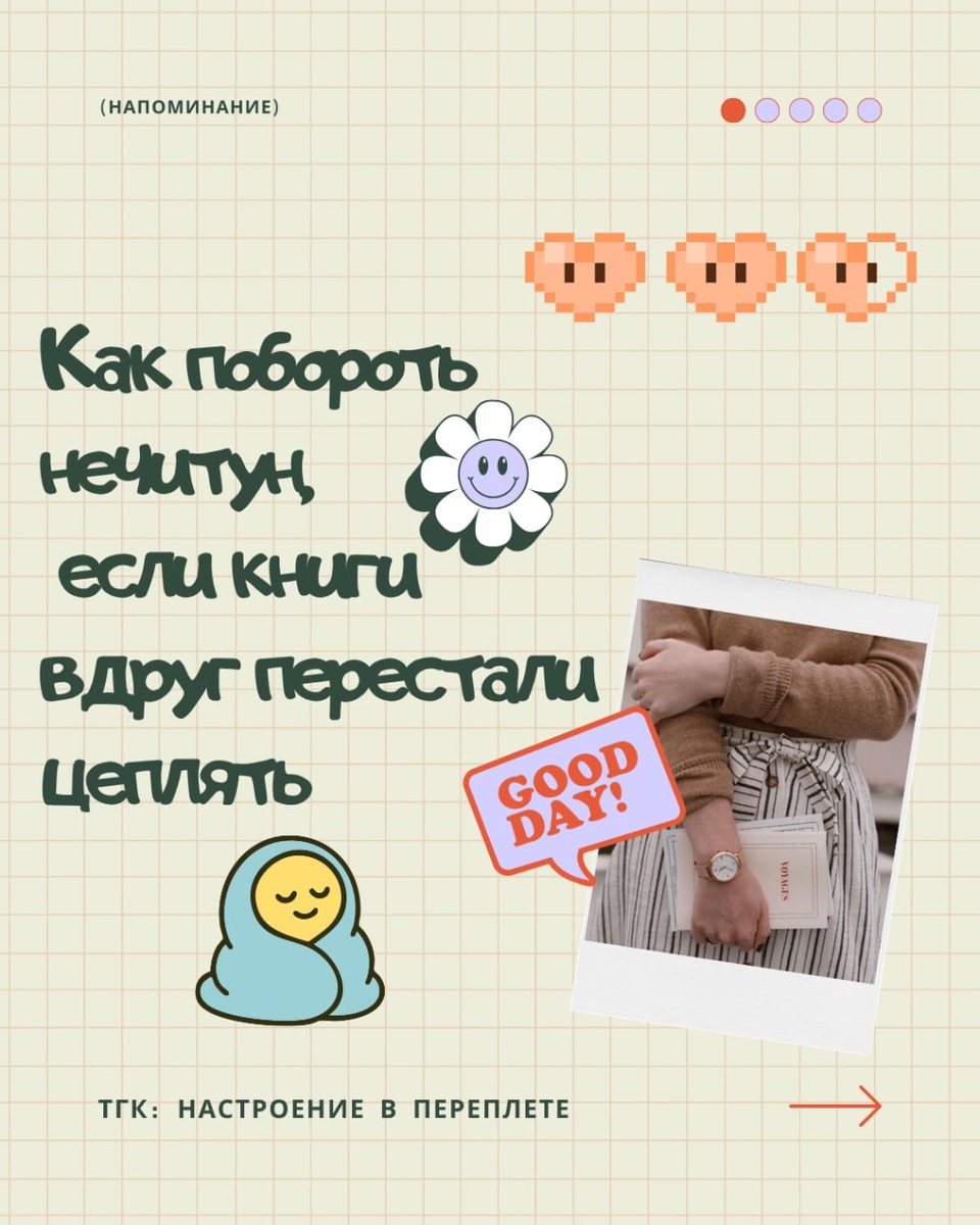 🌟🌟🌟вами мыслью о том, что 🌟🌟🌟 неделю не читаю, и внутри это почему-то отзывается тревогой (тык, кто пропустил) И, наверное, после того поста (и ваших комментариев) мне захотелось продолжить эту тему 🤩 уже чуть более просто и наглядно. Потому что нечитун – это не всегда что-то, с чем нужно срочно бороться 📖 Но всё-таки бывают моменты, когда хочется не просто ждать, а немного помочь себе вернуться к книгам мягче. Без давления, без чувства вины и без попытки за один вечер снова стать "человеком, который читает". Поэтому сегодня собрала в слайды несколько лёгких вещей, которые помогают мне в такие периоды 🌟 Не как универсальный рецепт, а как маленькие способы сделать себе не тяжелее. 🪶 Может быть, что-то из этого тоже вам откликнется 🫖 #читательскиемысли Настроение в переплете