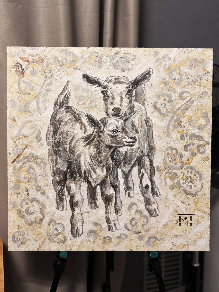 «Дружба» 60х60 см. ОСБ. Акрил. Продолжаю серию «Детства». С ранними работами вы уже знакомы, например триптих «Козки», который был представлен на выставке «Трын-Трава» в октябре 2025г. в усадьбе Муравьевых - Апостолов. Фон картины был дополнен орнаментами, которые напоминают роспись сервиза Дулевского фарфорового завода. *находится в частной коллекции.