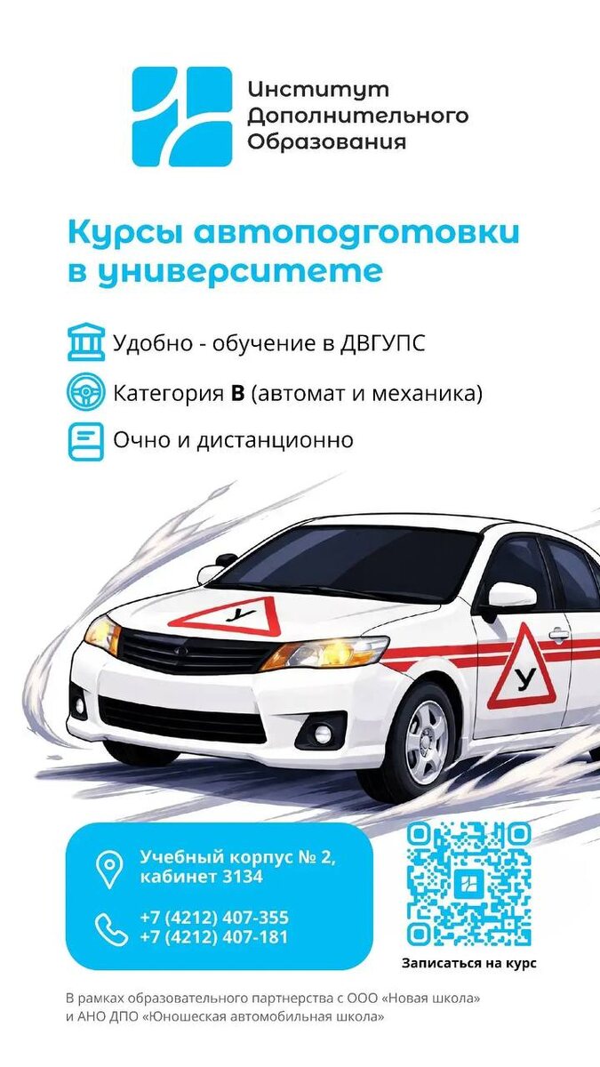 Институт дополнительного образования ДВГУПС в рамках образовательного партнерства с ООО «Новая школа» и АНО ДПО «Юношеская автомобильная школа» приглашает на курсы по подготовке и переподготовке водителей. 📎 Категория «В»: Срок обучения: 2,5 месяца. Освоение теории возможно очно или дистанционно. 📎 Переподготовка с категории «С» на «В»: Срок обучения: 1,5 месяца. 📎 Повышение квалификации для водителей категории «В» (с автоматической трансмиссии на механическую): Срок обучения: 1 месяц. 📎Для записи и дополнительной информации обращайтесь 📞по телефонам: 8(4212)407-355 8(4212)407-181 📎 или электронной почте: ckpsis@ido-dvgups.ru