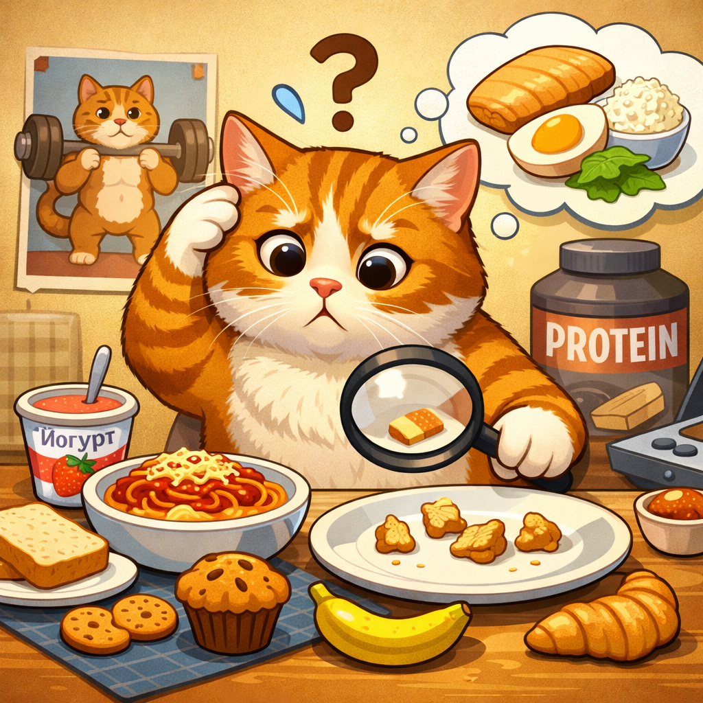 Иногда белок не исчезает из рациона громко. Он исчезает по-тихому: в сладком йогурте вместо нормальной еды, в салате с тремя кусочками курицы, в ужине из одного гарнира, в завтраке на кофе и каше, в перекусах, которые только изображают помощь.