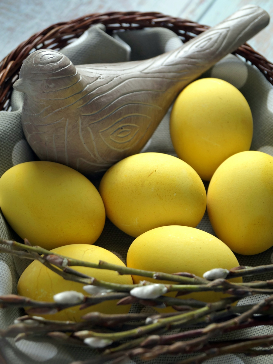 Покрасить яйца в ярко-желтый или золотистый цвет можно, отварив их в растворе с куркумой.