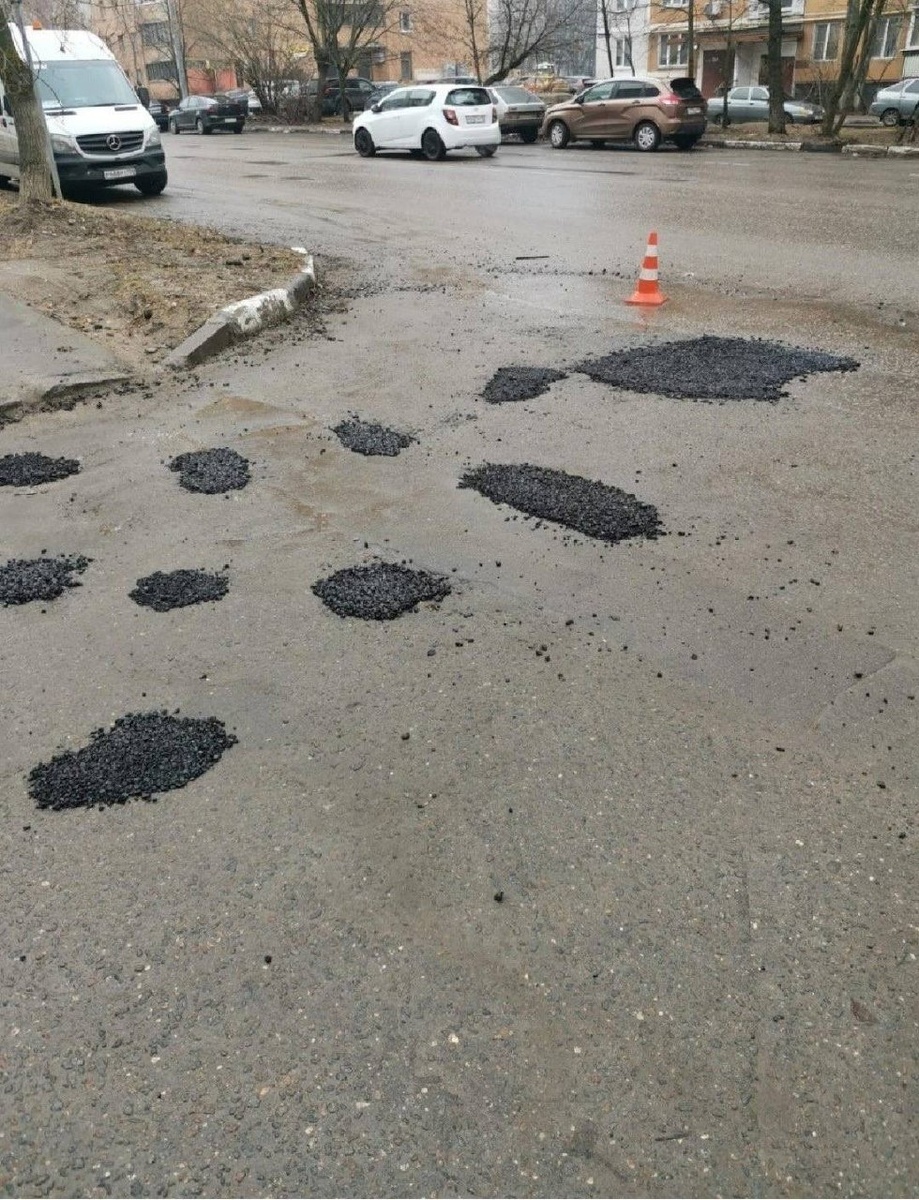 📋 «Отчёт о благоустройстве: — Ямы: обнаружены. — Асфальт: применён фрагментарно. — Эстетика: на высоте (если любите пэчворк). — Конус: установлен для пущего антуража. Вывод: работа выполнена. Искусство — осталось.» 😄