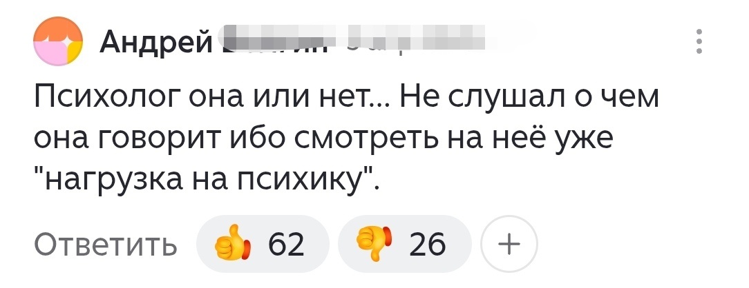 Не скажу, что я зачитываюсь статьями и засматриваюсь видосами этой женщины-психолога, но иногда могу глянуть. Недавно вот посмотрела небольшое интервью с ней у Юли Меньшовой. Под публикациями, как правило, много комментариев. По теме. Но всегда встречаются и такие, в которых комментаторы "проходятся" по внешности дамы. Разделяющих мнение Андрея, как можно заметить по количеству лайков, довольно много. И я его понимаю. Хотя и не могу назвать лично для себя серьёзной нагрузкой на психику то, что приходится видеть: немолодую даму с разноцветными "весёленькими" волосами (особенно на фоне безупречно стильной Меньшовой). Толерантно отношусь к такого рода фрикам проявлениям себя через внешность в любом возрасте. Но запретить себе думать разные мысли тоже не могу и не хочу. И не одна я: С последним утверждением категорически не соглашусь! Очень не люблю, когда охаивают психологов, скопом, всех. Считаю, что они очень важны и нужны в нашей жизни, даже не смотря на то, что некоторые представ