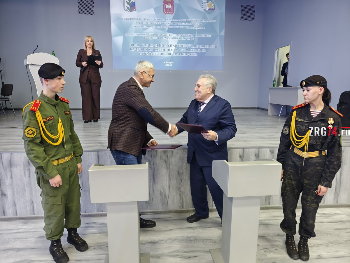 Кульминацией заседания стало подписание соглашения о сотрудничестве и взаимодействии между Челябинской областной организацией профсоюза работников народного образования и науки и Ассоциацией директоров профессиональных образовательных организаций Челябинской области на 2026—2028 годы. Председатель Ассоциации директоров СПО Дмитрий Петров охарактеризовал это событие как историческое. Он отметил, что ассоциация и профсоюз уже давно стали одной большой семьёй, а официальное закрепление их дружеских отношений и чёткого регламента взаимодействия гарантирует успешное продолжение общей работы. В завершение официальной части мероприятия прошло торжественное награждение отличившихся сотрудников техникума благодарственными письмами от имени депутата Государственной думы Дмитрия Вяткина.