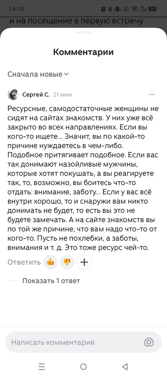 Потом ожидаемо было написано, что у ресурсных женщин закрыты все запросы, они, мол, на знакомствах не сидят. Знаю ресурсных и свободных от отношений женщин, которые там сидят. Да, без результата, потому что ищут что-то нормальное, а не жру...едоков их борщей, но сидят же.