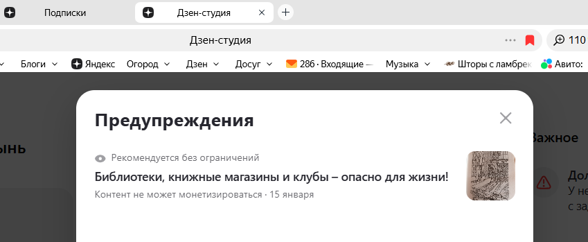 Совершенно случайно увидела замечание от великого Дзена в свой адрес. И даже рада, что меня заметили. Раньше что-то присылали на электронную почту, теперь информация появилась в сообщениях. Предупреждение вынесли 15 января, а статья написана 27 декабря 2025 года. Что ж, лучше поздно, чем никогда. А что такого страшного написано в этой статье, что мне погрозили пальчиком? Это подборка детективов, где действие происходит в книжных магазинах, книжных клубах и библиотеках. Спрашивается, про что будет идти речь, если это детективы? Разумеется, о преступлениях, и в конкретной подборке все преступления совершены против личности, причем личностям причиняется вред в самой тяжкой форме. В обзоре никак не могла обойтись без присутствующих в заголовках слов т.р.у.п и у.б.и.й.с.т.в.о, видимо, это и напугало чувствительный искусственный интеллект. О чем же меня предупреждают? Статья рекомендуется без ограничений, значит, ее можно продолжать читать, в том числе и рекламные блоки. Только вот монетизир