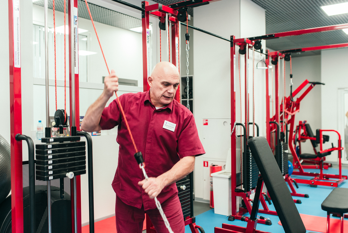 У пациентов центров современной кинезитерапии это упражнение является одним из самых любимых — видимо, потому, что подавляющая часть пациентов не способна полноценно вращать руками по полному кругу, а это упражнение создает такую возможность. А так как эти мышцы рассчитаны на вращение, то при выполнении данного упражнения такая возможность создается идеально: с одной стороны, декомпрессия — это растяжение, которое устраняет ригидность (жесткость) этих мышц. А с другой — груз для растяжения этих мышц подбирается индивидуально благодаря его четкой дифференцировке с шагом между весами от 2,5 до 5 кг. И чем больше вес отягощения, тем лучше эластичность мышц плечевого сустава (фото 1). Условное количество повторений зависит от комфортности ощущений — от 8 до 12 вращений каждой рукой. Сделано! Но для полноценного ощущения всего упражнения необходимо растянуть еще больше грудные мышцы, которые у большинства людей и слабые, и ригидные (жесткие). Не любят отжиматься люди, да еще и на брусьях,