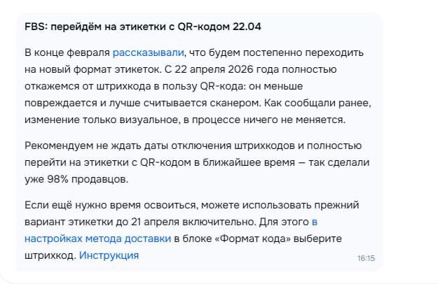 С 22 апреля убирают штрихкоды. Остаются только QR-коды на этикетках. Официально — «лучше читается, меньше повреждается». И, конечно, «ничего в процессе не меняется». Теперь к реальности. На коробках уже есть QR-коды. Честный знак, маркировка — всё это тоже QR. И выглядят они для сканера одинаково. Что дальше? Сканер взял не тот код → товар «не найден» → «не смогли доставить» → дальше по классике с последствиями для селлера. Похоже, что добавляют ещё одну точку, где можно ошибиться. По факту меняют формат этикетки, но не меняют качество процессов вокруг. Если у вас плохо прогружаются файлы, все посты также доступны в MAX