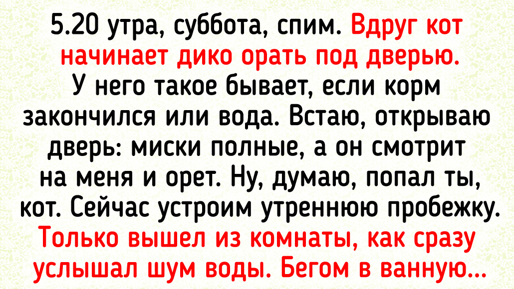 5.20 утра, суббота, спим. Вдруг кот начинает дико орать под дверью. У него такое бывает, если корм закончился или вода. Встаю, открываю дверь: миски полные, а он смотрит на меня и орет. Ну, думаю, попал ты, кот. Сейчас устроим утреннюю пробежку. Только вышел из комнаты, как сразу услышал шум воды. Бегом в ванную, а там бойлер лопнул и заливал все водой. А у кота как раз там туалет. В итоге все перекрыл, начал вытирать воду, а там чуть-чуть, видимо, только началось, и кот нас разбудил. В итоге кот был покормлен вкусняшками. Спасибо тебе, шерстяной. © CrAzY.IT / Pikabu