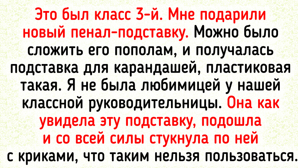 Это был класс 3-й. Мне подарили новый пенал-подставку. Можно было сложить его пополам, и получалась подставка для карандашей, пластиковая такая. Я не была любимицей у нашей классной руководительницы. Она как увидела эту подставку, подошла и со всей силы стукнула по ней с криками, что таким нельзя пользоваться. Подставка упала, все рассыпалось, она схватила ее и стала раскидывать по всему кабинету карандаши, ручки. Со слезами на глазах я на коленях ползала по кабинету и все собирала. Некоторым людям должно быть запрещено работать в школе. © Programmistka / Pikabu