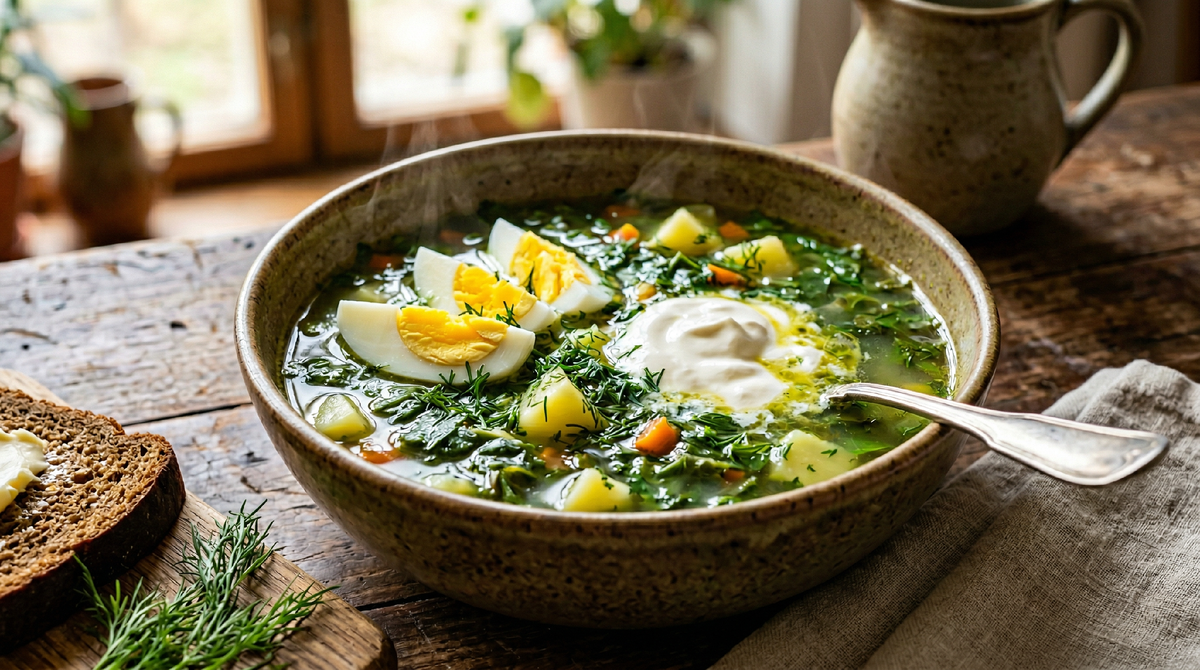 Помню, как бабушка выходила в огород ранним апрельским утром, когда роса ещё блестела на траве, и возвращалась с пучком щавеля, перетянутым обычной ниткой. На кухне уже кипела вода в большой эмалированной кастрюле, пахло укропом и варёным яйцом. Она никогда не сверялась с рецептами, всё делала на глаз, но суп получался каждый раз одинаково вкусным — густым, кисловатым, с разваренной картошкой и половинками яиц, которые плавали на поверхности, как маленькие лодочки. Я садился за стол, она ставила передо мной глубокую тарелку, клала ложку сметаны, и я ел, обжигаясь, потому что ждать не хватало терпения.