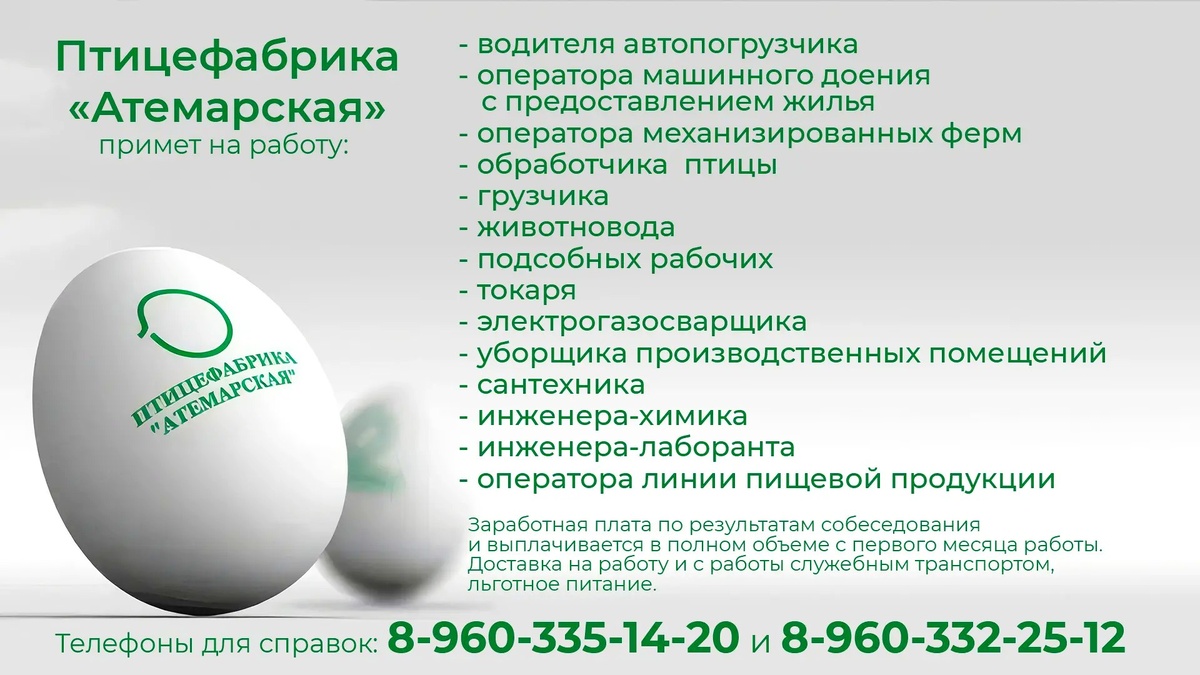 » Птицефабрика «Атемарская» примет на работу #РаботаВМордовии Город N13 | Саранск Читать на сайте: https://info-rm.com/lenta/board/ptitsefabrika-atemarskaya/