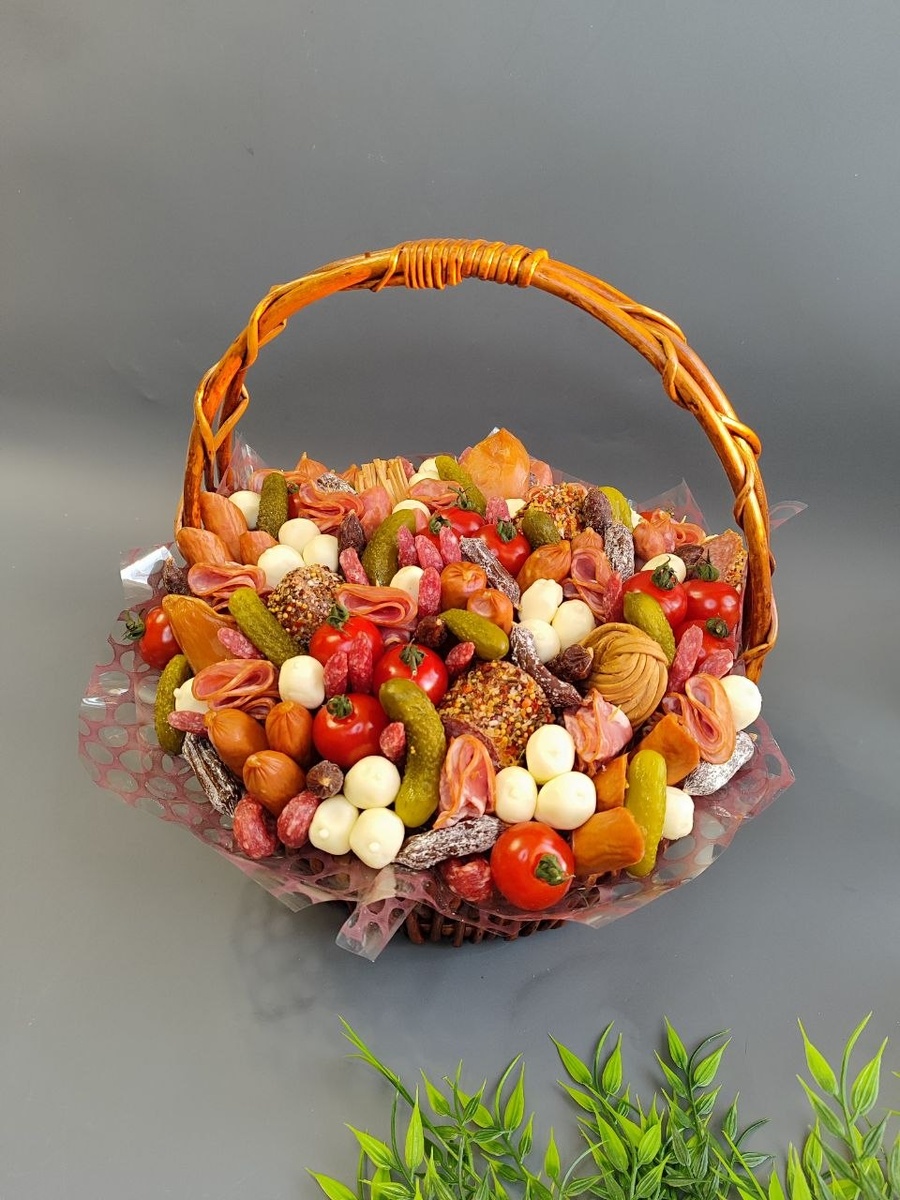 Шикарная корзина с разнообразием колбас и сыров, помидорами черри и карпаччо уже в пути для поздравления с днем рождения. Ух, какой вкусный будет праздник!!!