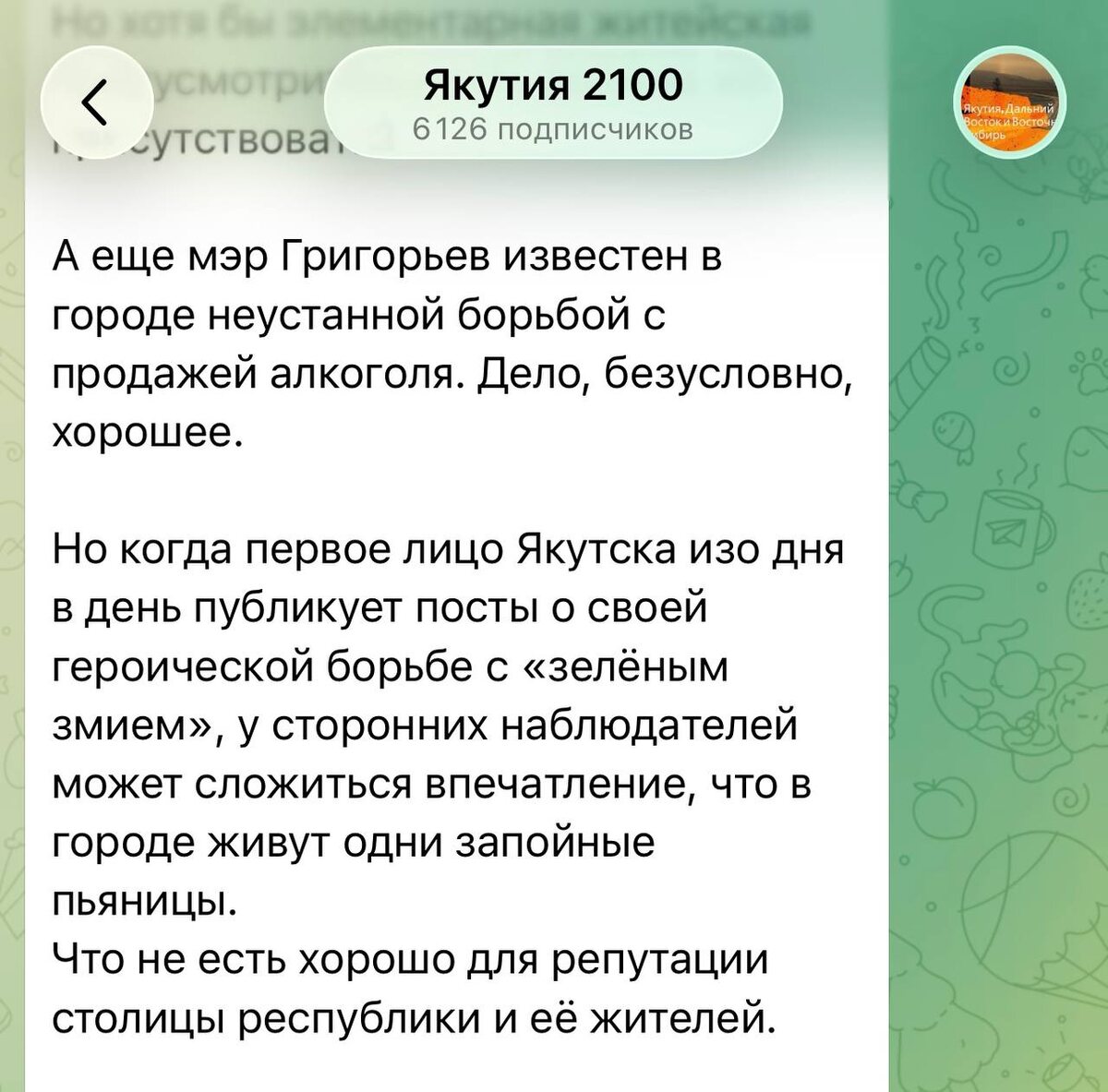 В АГиП долго думали, как нивелировать успехи мэра Евгения Григорьева в борьбе с алкоголем, и придумали! Его обвинили в том, что он слишком много уделяет внимания борьбе с пьянством, что, по мнению, республиканских чиновников «создает у сторонних наблюдателей впечатление, что в Якутске живут одни запойные пьяницы». С таким же успехом можно наехать на прокурора Якутии Сергея Дябкина, обвинив его в том, что он слишком много говорит о борьбе с коррупцией, что создает у сторонних наблюдателей впечатление, что в Якутии слишком много коррупционеров. Если у вас плохо прогружаются видео и фото, все новости ТОРБОЗНОГО РАДИО также доступны в канале MAX 📲, ДЗЕН 📝 и ВКонтакте 💙