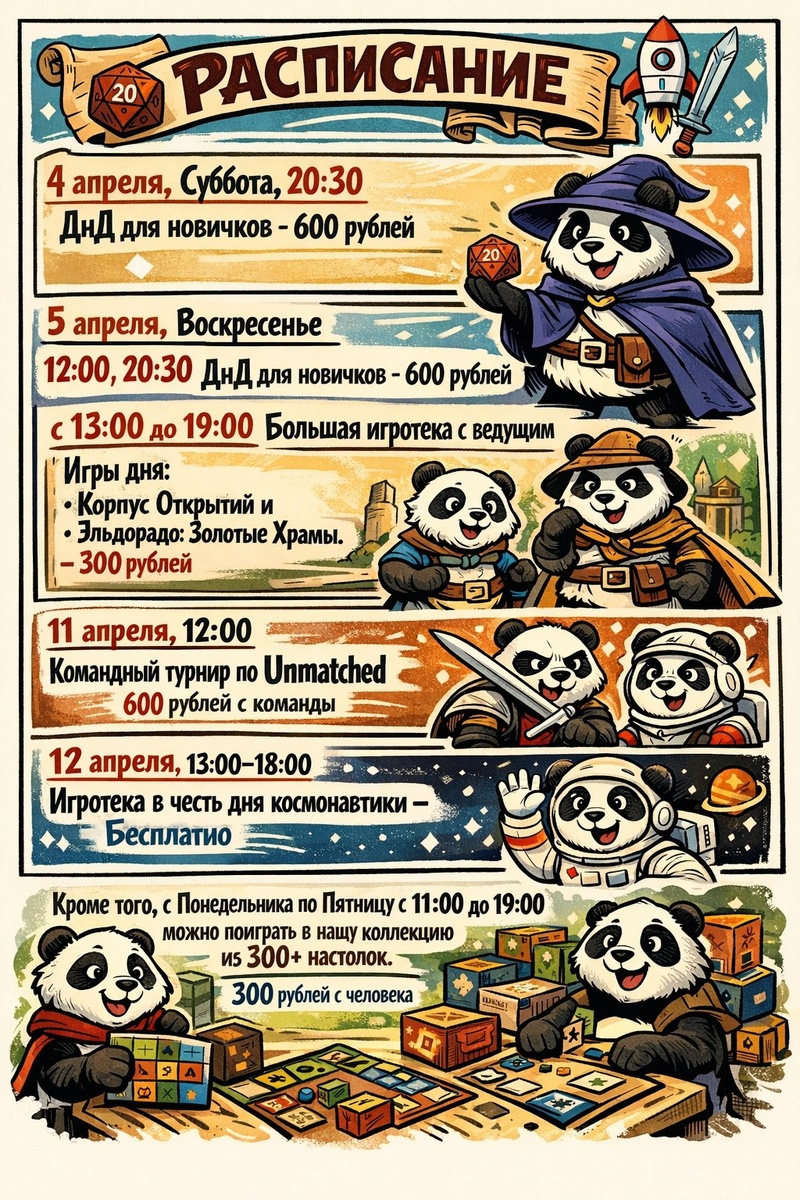 🎲 📍 Суворова, 52А 🐼 ДнД для новичков ⚠️ Осталось совсем немного мест: • 4 апреля (сб), 20:30 — 1 место • 5 апреля (вс), 12:00 — 1 место 🌙 5 апреля (вс), 20:30 — 4 места 💰 600 ₽ 🎲 5 апреля (вс), 13:00–19:00 🔥 Большая игротека с ведущим Игры дня: • Корпус Открытий • Эльдорадо: Золотые Храмы 💰 300 ₽ ⚔️ 11 апреля, 12:00 🏆 Командный турнир по Unmatched 💰 600 ₽ с команды 🚀 12 апреля, 13:00–18:00 🌌 Игротека в честь дня космонавтики 💰 БЕСПЛАТНО 🎯 Каждый будний день (Пн–Пт, 11:00–19:00) 🎲 Играй в нашу коллекцию из 300+ настолок 💰 300 ₽ с человека 💬 Есть вопросы? Пиши или звони: +7 908 177-87-17