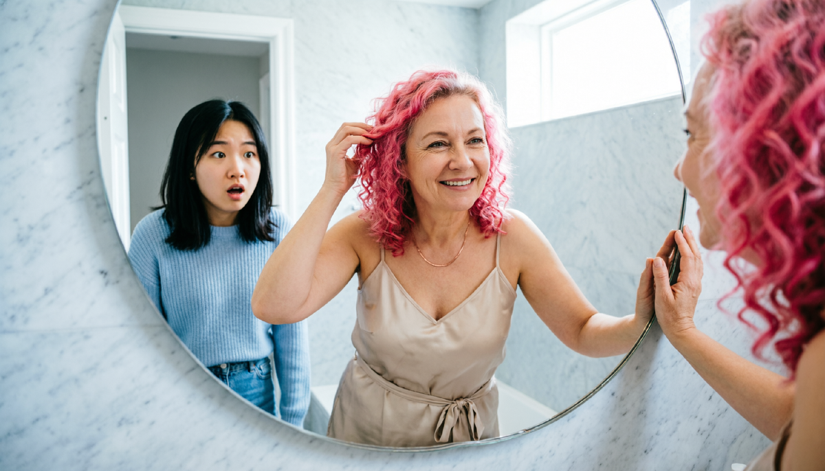 Меня зовут Елена. Мне 55 лет. Вчера я сделала то, что хотела сделать 30 лет. Я покрасила волосы в розовый. Не бледно-розовый, не "натуральный". В яркий, вызывающий, кричащий розовый. Как у панк-рокерш из моего детства. Как у девчонок, которых я боялась даже приветствовать. Всю жизнь я была "приличной". Хорошая девочка, отличница, потом хорошая жена, потом хорошая мать. Я никогда не выделялась. Носила то, что принято. Стриглась, как принято. Красилась в натуральные оттенки. Я боялась осуждения. Боялась, что подумают люди. Боялась, что скажет мама. Мама умерла пять лет назад. Ей было 80. Она прожила жизнь в сером. Не потому что не любила цвет, а потому что "так надо". Я не хочу так. Дочь сказала: