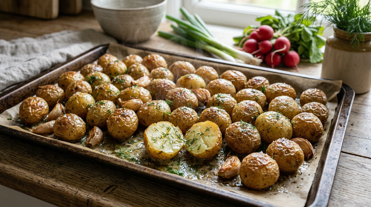 Когда видите первую молодую картошку в сезоне — не откладывайте. Берите килограмм, несите домой, включайте духовку. Тот самый первый противень в году — это событие, маленький домашний праздник, который невозможно перенести на потом.