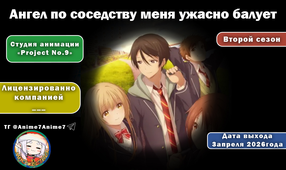 " Ангел по соседству" второй сезон - первая серия уже 3 апреля Четвёртый сезон Римурчика появится 3апреля Последняя часть последнего сезона аниме" Доктор стоун" уже 2апреля Четвёртый сезон Зерки появится на ваших экранах 8 апреля Четвёртый сезон" Добро пожаловать в класс превосходства" - начнёт выходить первого апреля Второй сезон" Операция: Семейка Ёдзакура" - 12апреля " Девушка на час" и её пятый сезон уже 8апреля Второй сезон" Меч и жезл Вистории" начнёт свой выход 12апреля Вторая презентация" Начало после конца" - 1апреля " Явись, Ирума! 4 cезон" и, как сошлось ведь, выход 4 апреля "Путь аса: Акт II сезон второй" 5 апреля "Королева, ставшая причиной трагедии, сделает для народа всё, что в её силах 2" 7 апреля Второй сезон Дорохедорки первого "Я переродился торговым автоматом и скитаюсь по лабиринту 3" 1 апреля Подпишись