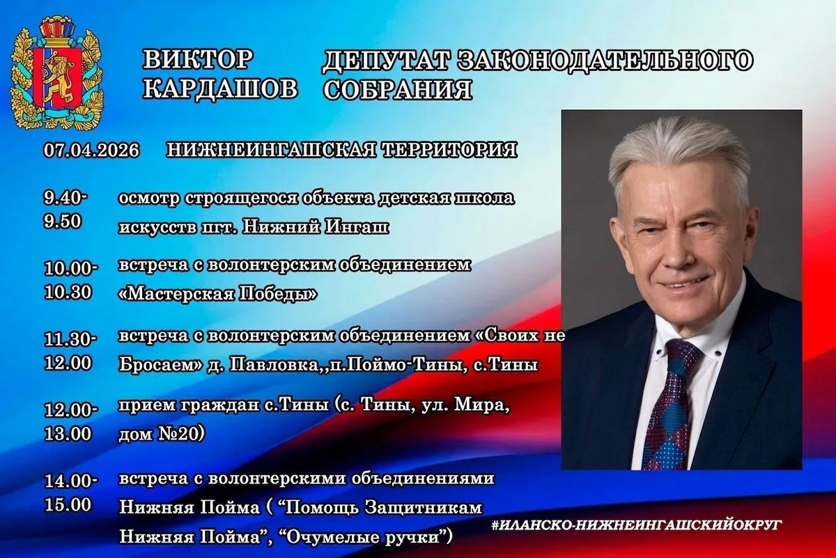 📌 Депутат Законодательного Собрания Красноярского края Виктор Кардашов в апреле посетит Иланско-Нижнеингашский округ