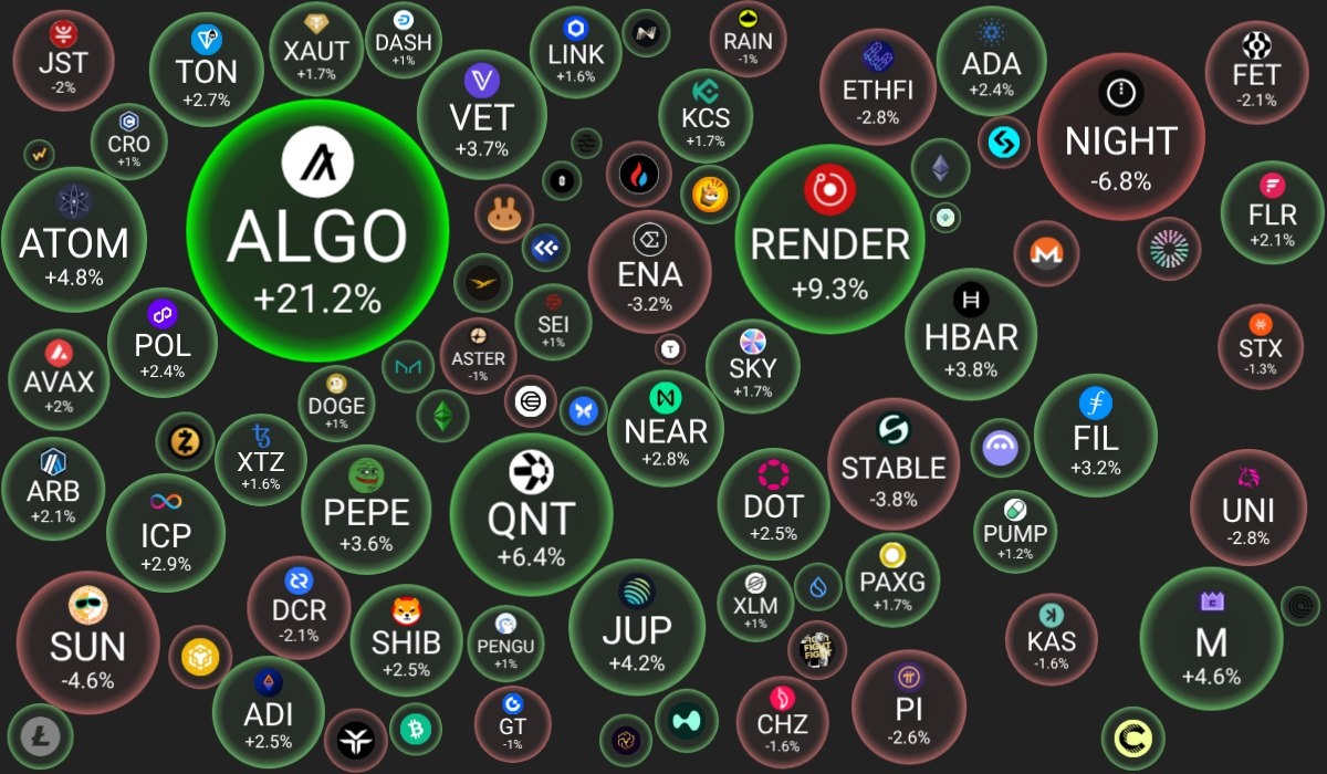 🗓 03.04.2026 09:30 по Москве. 🔗 Посмотреть на сайте 📈 Лидеры роста (из ТОП-100): 🟢 Algorand (ALGO): $0.1196 (+21%) 🟢 Render (RENDER): $1.8948 (+9.2%) 🟢 Quant (QNT): $75.04 (+6.4%) 📉 Лидеры падения (из ТОП-100): 🔴 Midnight (NIGHT): $0.0460 (-6.9%) 🔴 Sun Token (SUN): $0.0171 (-4.6%) 🔴 Stable (STABLE): $0.0284 (-3.8%) 🔍 Основные метрики: 🟢 Общая капитализация: $2301.19 млрд (+0.16%) 🔴 Общий объем торгов: $83.38 млрд (-18.14%) 🔴 Доминация Bitcoin: 57.93% (-0.11%) 🟢 Доминация Ethereum: 10.81% (+0.04%) 🔴 Индекс страха и жадности: 9 / 100: ЭКСТРЕМАЛЬНЫЙ СТРАХ (-3) 🔴 Индекс Альтсезона: 37 / 100: НЕ АЛЬТКОИН-СЕЗОН (-6) 📖 Интересно почитать: 👉 Что такое Рыночная капитализация криптовалют 😻 Наши сервисы и бонусы: 💰 Cryptoage.com - рассказываем про Блокчейн и Криптовалюты с 2013 года 👛 Antarctic Wallet - Оплата криптой в магазинах по QR-коду. Безопасный вывод USDT на карту.