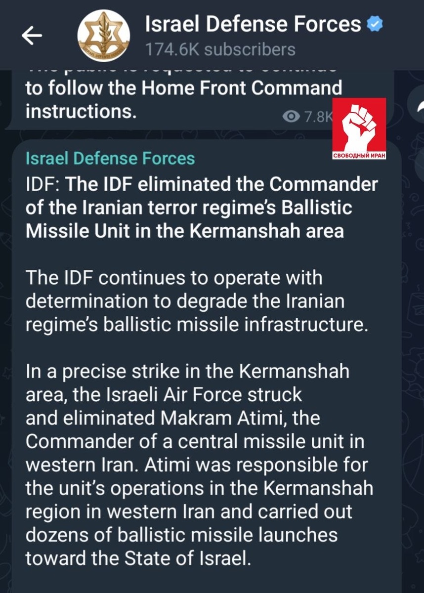 🚀 Ливидированный Макрам Атими был командиром центрального подразделения ракетных войск в западном Иране, в районе Керманшаха. По данным армии, именно он отвечал за запуск десятков баллистических ракет в сторону Израиля. Источник: пресс-служба армии Израиля. #Израиль #авиаудары #Иран #Керманшах #ракетныевойска Подпишитесь на канал