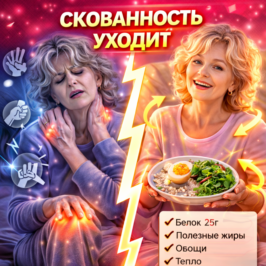 Пальцы утром не сгибались, спина «расходилась» полчаса. Я изменила завтрак после 60 — и скованность начала уходить уже через неделю. Знаете, какое ощущение стало появляться у меня после шестидесяти чаще всего? Не боль. А именно скованность. Просыпаешься — и тело будто чужое. Пальцы сгибаются медленно. Шея не поворачивается сразу. Колени нужно «разрабатывать». Сначала я думала — возраст. Потом — погода. Потом — давление. Но однажды ревматолог сказал вещь, которая меня удивила: «Очень часто утренняя скованность зависит от того, чем начинается ваш день». Я тогда даже переспросила: — От завтрака? Оказалось — да. Я изменила несколько утренних продуктов. И уже через неделю почувствовала разницу. Рассказываю, что действительно работает. Раньше я начинала утро с чая. Но врач объяснил простую вещь. После сна суставам нужна жидкость. Ночью организм теряет воду. И суставная жидкость становится гуще. Теперь первым делом утром я пью стакан тёплой воды. Без сахара. Без добавок. Иногда с долькой лим