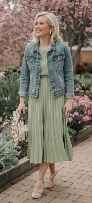 Платье с цветочным принтом + джинсовкаПлатье пастельного зелёного оттенка с мелким цветочным узором прекрасно сочетается с классической синей или светло-голубой джинсовой курткой. Это идеальный вариант для тёплых летних дней или прогулок в парках.