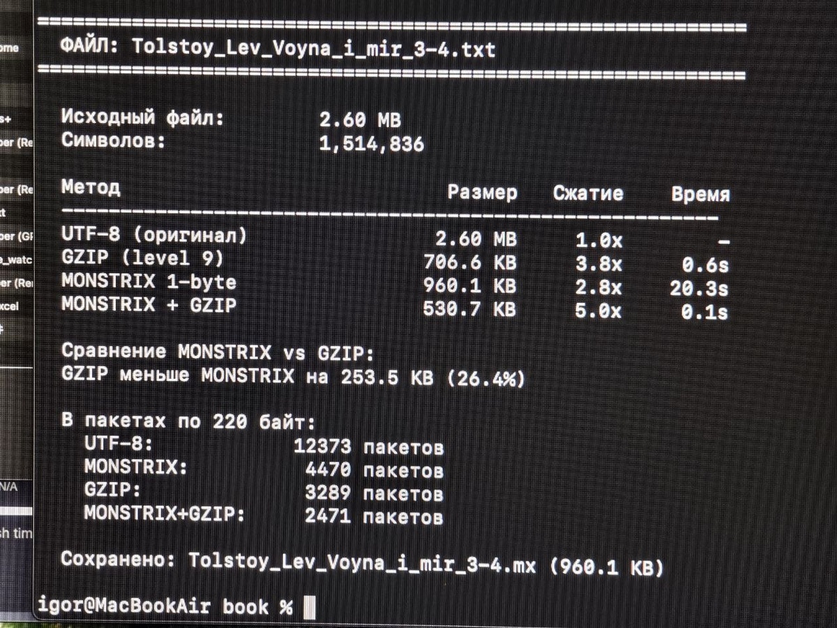 Кириллица в SMS — ~70 символов. В Meshtastic пакет — ~100 символов. А транслитом — уже 160. Почему? Потому что один русский символ в UTF-8 весит 2 байта, а латинский — 1. Решил разобраться. Полез в стандарты, кодировки, частотный анализ. Прогнал через скрипт "Войну и мир", Пелевина, "Метро 2033", Духless — 5 миллионов символов. Нашёл закономерности: 30 самых частых слогов (то, ст, на, но, не, по...) покрывают огромную долю русского текста. Сделал свою кодировку. Один байт = одна буква ИЛИ целый слог. 33 буквы + 165 частых слогов и слов — всё в 256 значениях одного байта. Результат: 📦 "Война и мир" (txt) — 2.7 МБ → 928 КБ. В 3 раза меньше. 📦 Это БЕЗ архиватора. Просто другая кодировка. 📦 Если сверху zip — 518 КБ. В 5 раз меньше оригинала. Для сравнения: zip без моей кодировки жмёт до 700 КБ. То есть моя таблица + zip = лучше чем просто zip. Что это даёт на практике: — SMS: не 70, а ~200 кириллических символов — Meshtastic: не 100, а ~330 символов в пакете — И это читается на ле