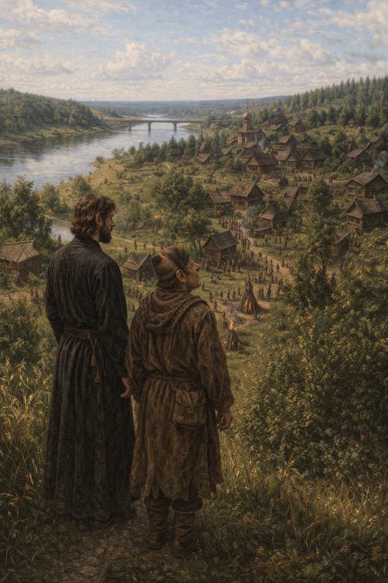 Когда они поднялись на знакомый пригорок, Иоанн сразу понял, что не ошибся. Внизу, между старыми дубами, лежало уже знакомое Дубово. Даже тогда, зимой, оно не умело быть тихим. В лютый мороз дети всё равно носились по улице, катались с обледеневшей горки и визжали так, будто никакой Мары на свете не существует. У колодца бранились бабы, мужики таскали дрова, собаки дрались из-за костей прямо посреди дороги. Дубово и тогда жило шумно, упрямо, словно назло зиме, страху и всему на свете. Теперь же над селом стояло настоящее лето. Тяжёлое, густое, пахнущее пылью, сеном и прогретой древесиной. И всё было почти таким же. Почти.