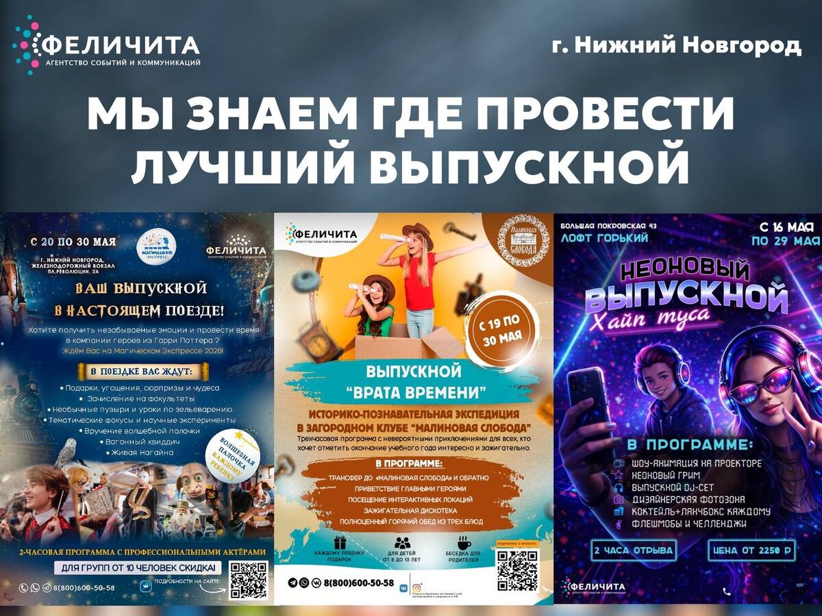в Нижнем Новгороде🔥 В этом году у нас сразу три новых проекта: 👫 ✨ Выпускной Экспедиция «Врата Времени» Волшебный праздник для ребят 1–5 класса и детского сада (21–31 мая) Проводится в загородном клубе «Малиновая слобода» на свежем воздухе🍃( питание + трансфер + беседка для родителей включено в стоимость ) Сайт: felichitahappe.ru/vrata ✨ 🚂 Магический экспресс 22, 23, 25 мая Погрузитесь в мир магии и волшебства вместе с героями книг о Гарри Поттере прямо в ДВИЖУЩЕМСЯ ПОЕЗДЕ (вода + подарок каждому ребенку 🎁) Сайт: https://felichitahappe.ru/magicexpress_nn 🎤 🔥Неоновый выпускной Хайп-туса Возраст 9+ (22–31 мая ) Весёлая вечеринка для подростков: диджей, яркие танцы и море позитива ждут вас ( питание + детские коктейли включены в стоимость ) Сайт: felichitahappe.ru/neon Выберите свой лучший выпускной🤩 📞 8 (800) 600-50-58 ‼️Для групп действуют скидки + сопровождающие бесплатно