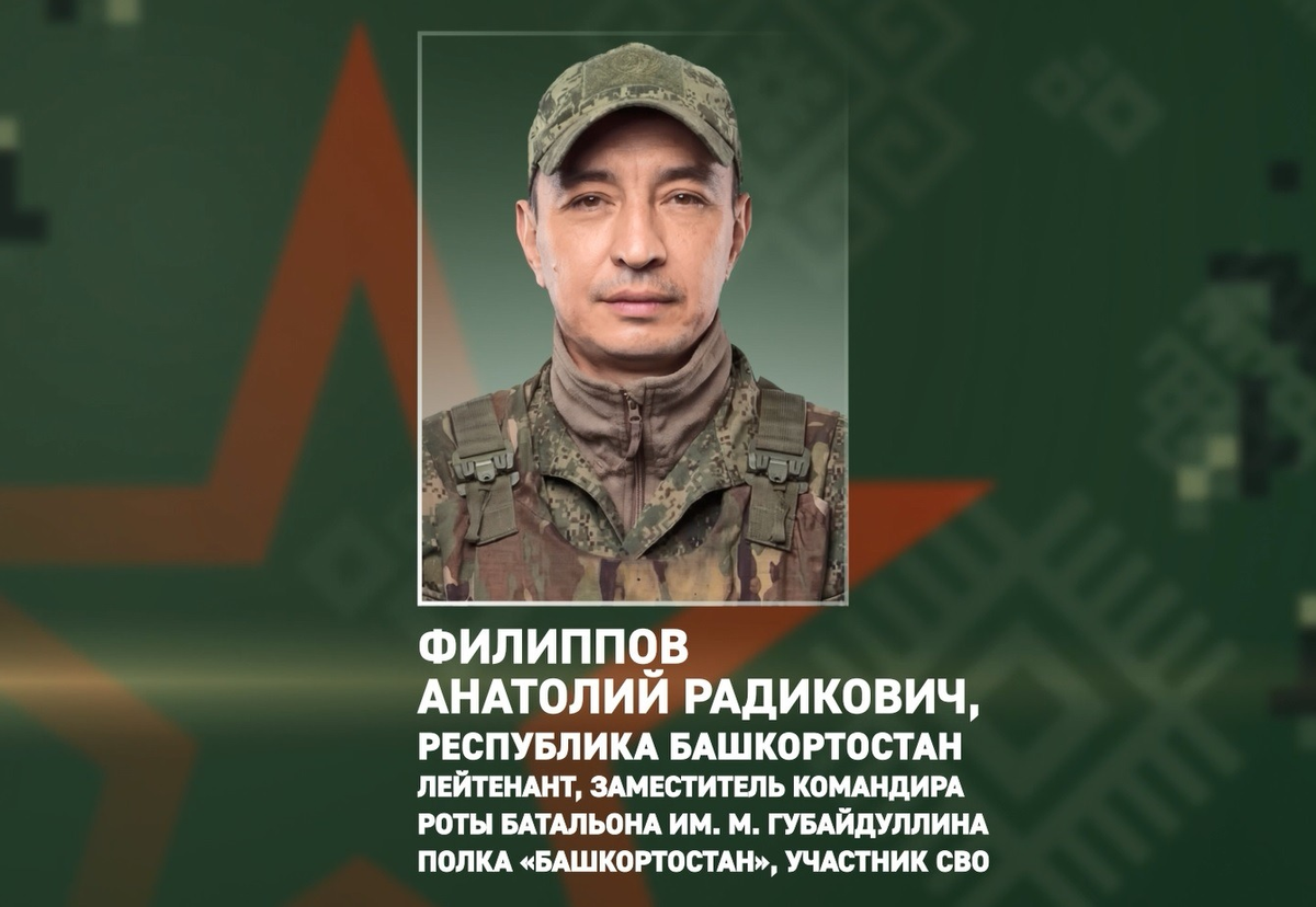 Заместитель командира штурмовой роты батальона имени Миннигали Губайдуллина мотострелкового полка «Башкортостан» Анатолий Филиппов представлен к государственной награде Луганской Народной Республики. Лейтенант Анатолий Филиппов и его подчинённые отразили атаку ВСУ и удержали оборону занятых позиций. Бойцов накрыл плотный миномётный огонь противника. Замкомроты руководил действиями штурмовиков решительно и хладнокровно. В результате противник отступил, понеся потери, а штурмовые отряды продолжили наступление. Ранее медалью ЛНР «За заслуги» II степени наградили участников СВО из Башкирии Линара Авзалова, Ильгиза Аюпова и Филюса Зарипова.