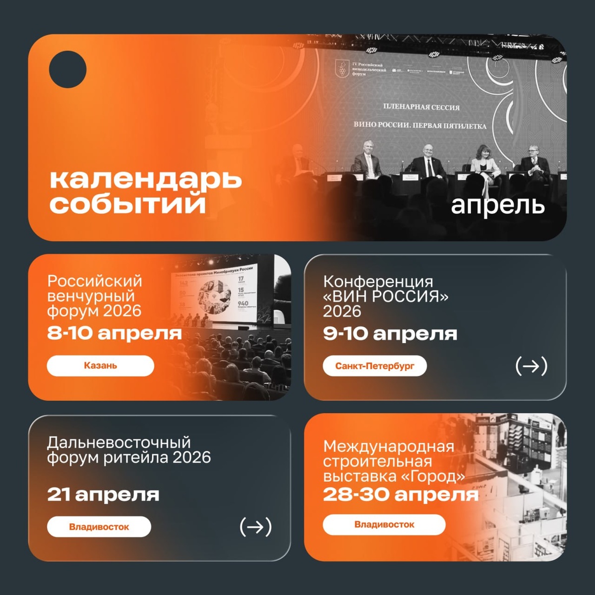 Апрель — время стратегии: пока одни готовятся к летнему сезону, другие ищут инвестиции и выстраивают партнёрские связи Собрали подборку деловых мероприятий для предпринимателей и топ-менеджеров в разных регионах России👇 ⭐️ Российский венчурный форум 2026 8–10 апреля 🔻 Казань | Офлайн Ключевое событие для технологических предпринимателей и инвесторов. В программе: поиск инвестиций, обсуждение трендов в сфере ИИ, робототехники и биотехнологий ⭐️ Конференция «ВИН РОССИЯ» 2026 9–10 апреля 🔻 Санкт-Петербург | Офлайн Конференция для топ-менеджеров, посвящённая автоматизации и роботизации производства, логистики и складов. В программе — бизнес-экскурсии на передовые предприятия и дискуссии по созданию «умного производства» ⭐️ Дальневосточный форум ритейла 2026 21 апреля 🔻 Владивосток | Офлайн Площадка для обсуждения будущего розничной торговли, развития российских брендов и трансформации потребительского рынка ⭐️ Международная строительная выставка «Город» 28–30 апреля 🔻 Владивосток