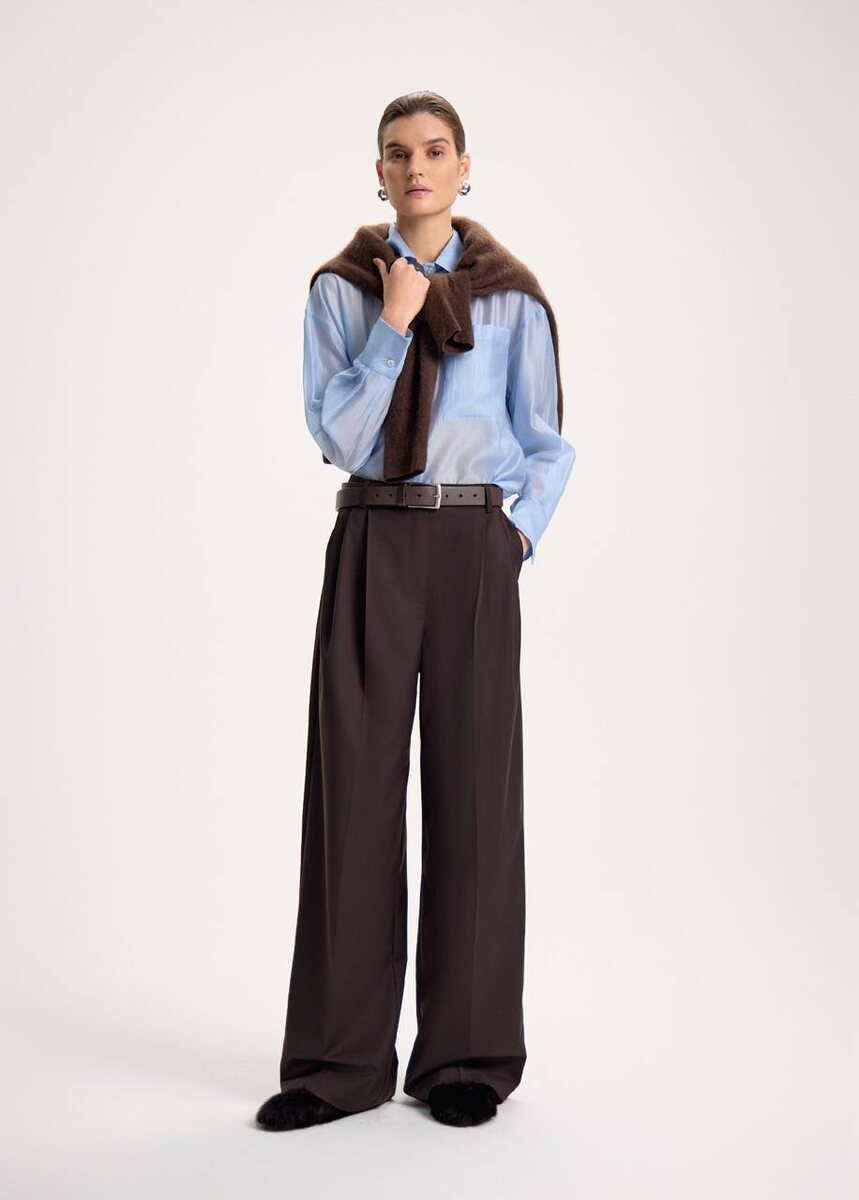 Складки на поясе, стрелки по всей длине, длина в пол. Объёмный силуэт, который держит форму. Мы искали ткань, которая сохраняет стрелки и складки в течение дня. Мягкая вискоза с полиэстером — именно то, что нужно. Покупатели замечают это сразу после примерки. Два цвета: шоколадный и чёрный. Сочетаются с новыми рубашками в полоску, курткой из экокожи, любым верхом из коллекции.