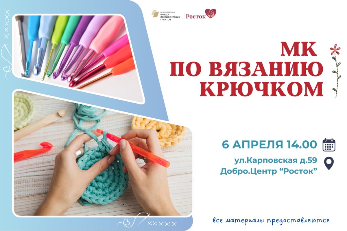🔥 Приглашаем на МК по вязанию крючком, которое состоится в понедельник 6 апреля в 14.00 в нашем Добро.Центре "Росток