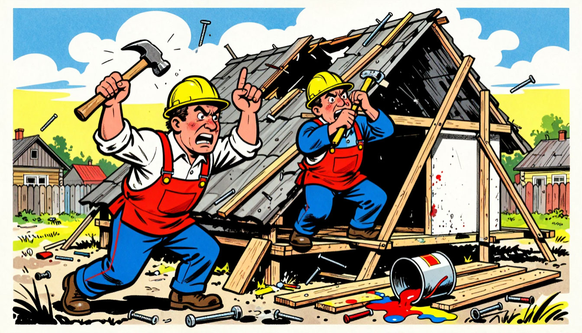 В деревне Нижние Бугры все знали: если Петрович и Ваня берутся за какое‑то дело — жди зрелищ. Эти двое умели превратить любой бытовой процесс в цирк с огнём, акробатикой и обязательным элементом «а что будет, если…». Петрович был человеком идейным. Он верил, что любую работу можно сделать быстрее, дешевле и… ну, хотя бы не хуже, чем у других. Ещё он верил в «интуитивный монтаж», «приблизительную геометрию» и «авось пронесёт». Ваня же был человеком осторожным. Он верил в инструкции, гвозди нужного размера и то, что «поспешишь — соседей насмешишь». А ещё он верил, что Петрович рано или поздно их обоих доведёт до больницы. Но в тот злополучный день судьба свела их вместе над кровлей старого дома Петровича. — Вань, глянь, какая красота! — размахивал руками Петрович, стоя на шатких лесах. — Ещё пара досок — и крыша готова. Мы ж с тобой гении! — Гении, — мрачно согласился Ваня, пытаясь прибить очередную доску, которая упорно не желала ложиться ровно. — Только почему‑то все гении у нас в дере