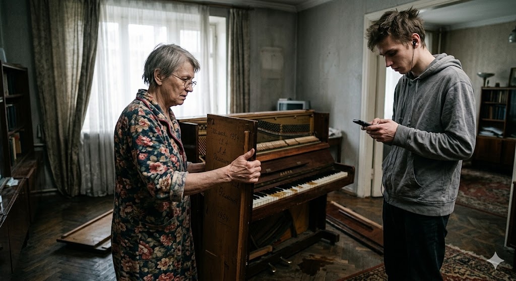За окном проехал трамвай — длинный скрежет по рельсам. Звук прошёл через комнату и затих. Антонина стояла и смотрела на внука, который говорил о скупке и запчастях, и пыталась вспомнить: когда он перестал быть тем мальчиком, который в семь лет стучал одним пальцем «Собачий вальс» на этих клавишах?
