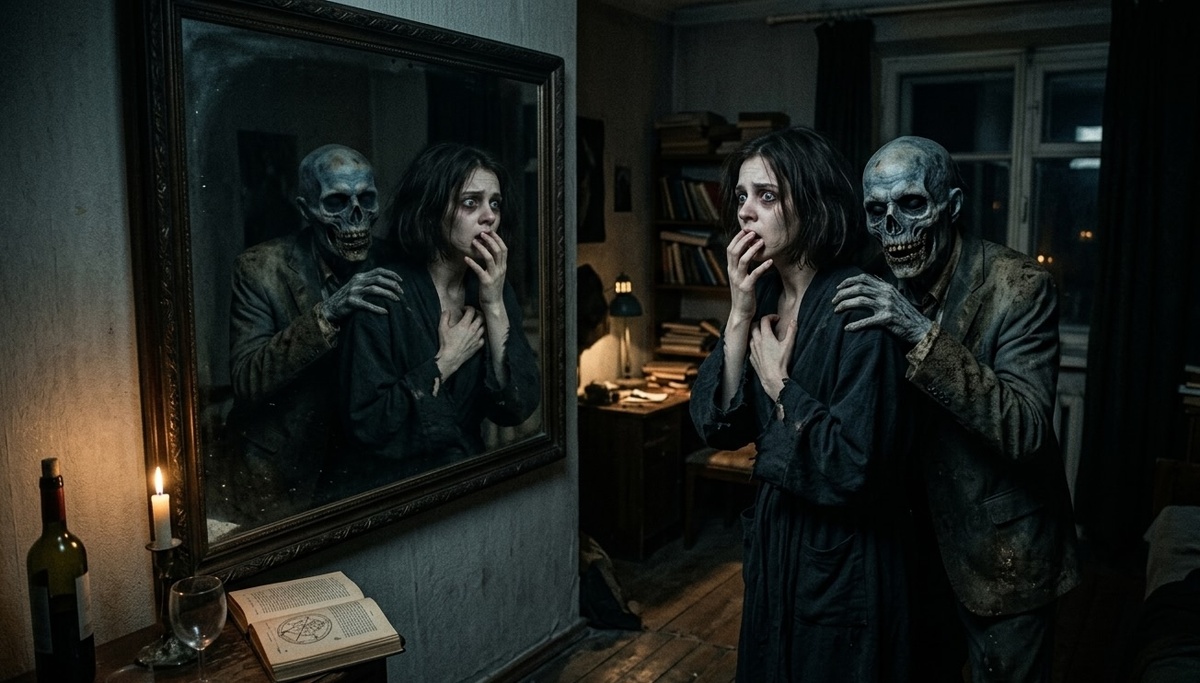 За её спиной, положив подбородок ей на плечо, стоял Мертвец. В отражении было видно, как его разлагающиеся губы растягиваются в подобии улыбки. Его рука — голая кость, обтянутая пергаментной кожей — медленно сжималась на её шее.
