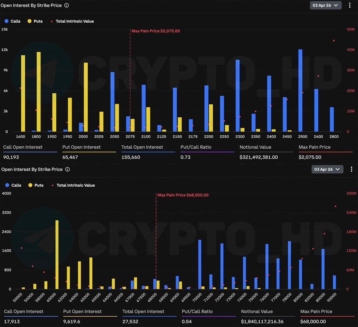 ) $1,84b в опционах на #BTC и $321m в опционах на #ETH. ▫️Зона основного интереса в BTC = $68,000. ▫️Зона основного интереса в ETH = $2075. Crypto Headlines