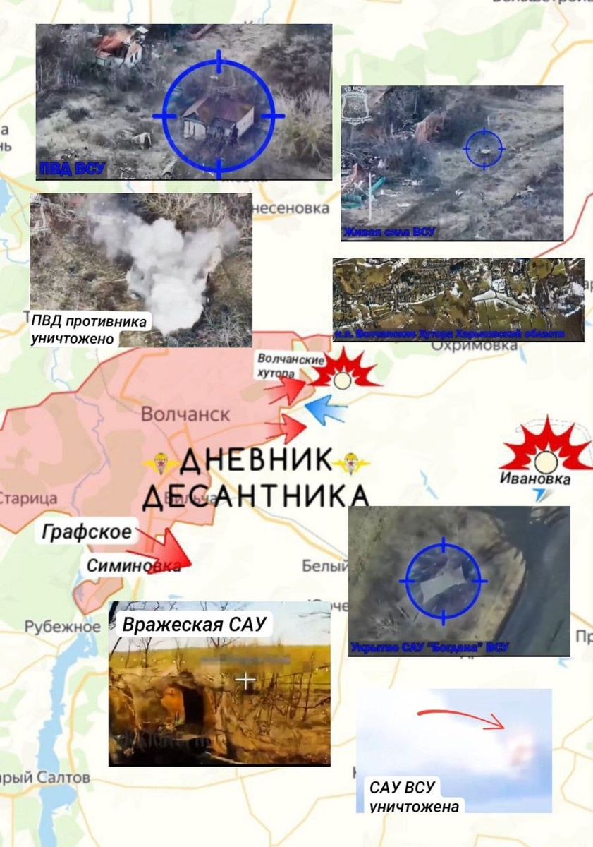 На направлении продолжаются ожесточенные бои. На нескольких участках фронта бойцы ВС РФ добиваются тактических успехов. Освободив Верхнюю Писаревку наши подразделения продвигаются вперёд. 🔥 В лесном массиве Волчанского района враг оборудовал артиллерийскую позицию, с которой расчет американской гаубицы М-101 наносил не избирательные удары в направлении наших позиций. По цели отработали военнослужащие 6 А ГВ "Север", которые поразили вражеское артиллерийское орудие. (видео) ▫️ Восточнее населенного пункта Графское в лесном массиве идут бои, восточнее села Симиновка нашими штурмовиками зачищено несколько лесополос. Дроноводы 71 гв. мсд ГВ "Север" обнаружили перемещение живой силы противника и ПВД на юго-восточной окраине населенного пункта Волчанские Хутора. Пункт дислокации с личным составом был уничтожен. В районе населенного пункта Ивановка в ходе разведки была обнаружена артиллерийская позиция откуда противник наносил удары по нашим позициям в окрестностях населенных пунктов Вол