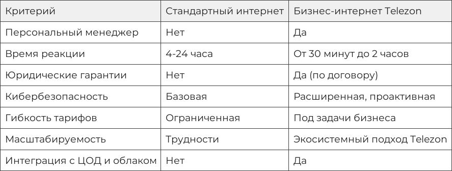 Таблица сравнения: стандартный интернет vs. бизнес-интернет Telezon
