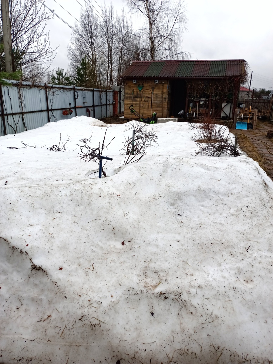 К крыжовнику, да и жимолости, ещё не подобраться. Снегом завалена поляна.
