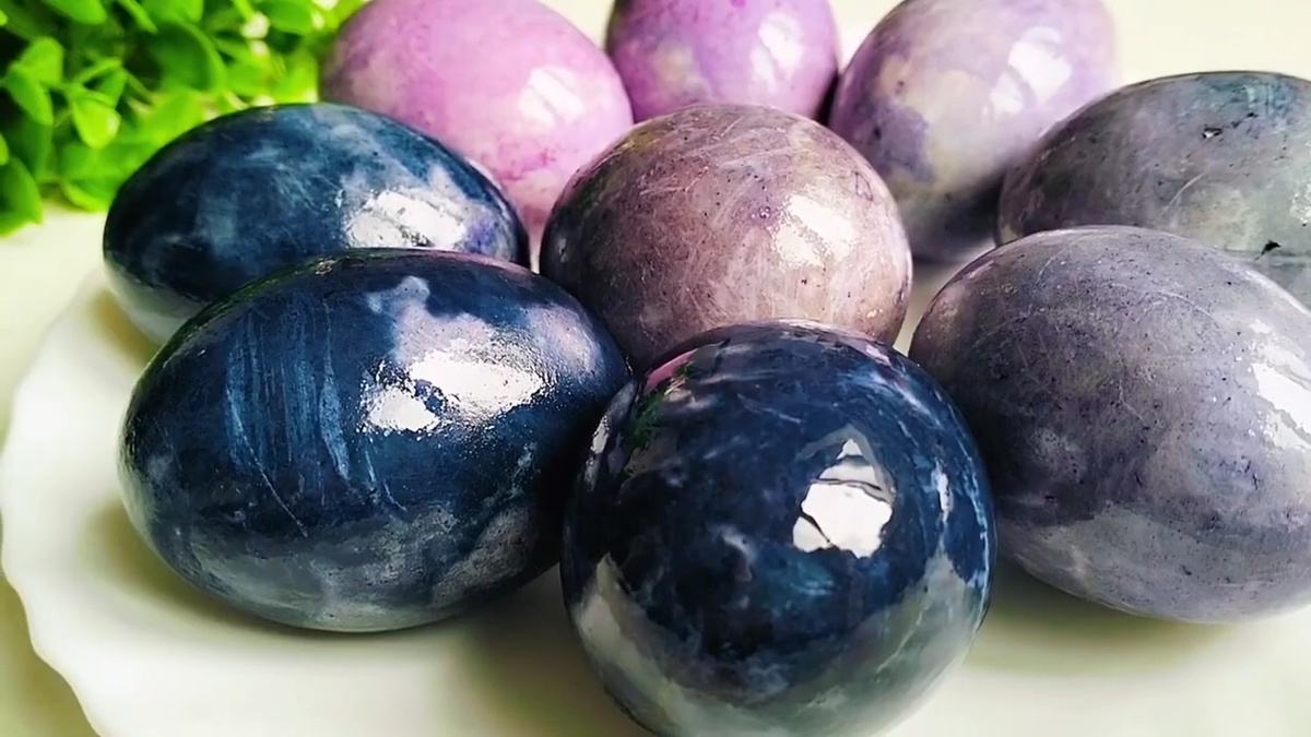 И, наконец, третья часть яиц осталось в отваре каркаде на 6 часов. Получился насыщенный, тёмно-синий цвет с мраморным переливами. Результат на фото.