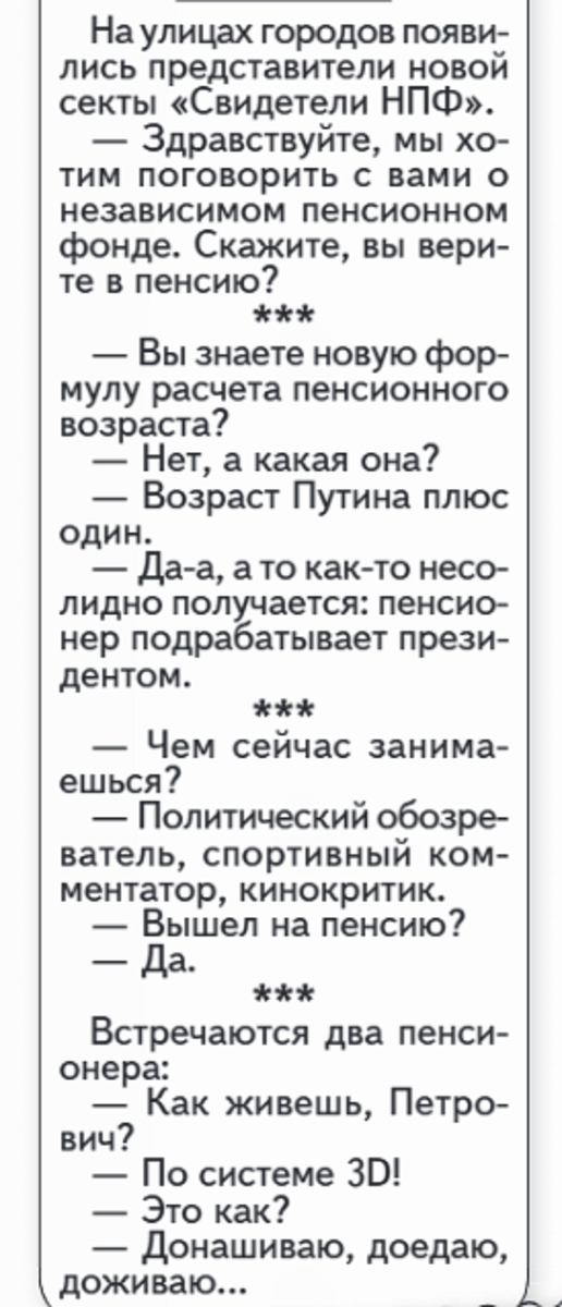 Одно спасает в этой жизни — это анекдоты. Прочитаешь пару смешных историй, улыбнёшься, и на душе сразу становится легче. А ещё иногда задумываешься: некоторым людям нынче ещё тяжелее, чем тебе. А что уж говорить о тех, кто пострадал от войны? И нам, пенсионерам, живущим под относительно мирным небом, в общем-то, ещё не так плохо — мы живы, у нас есть крыша над головой, и это уже хорошо.