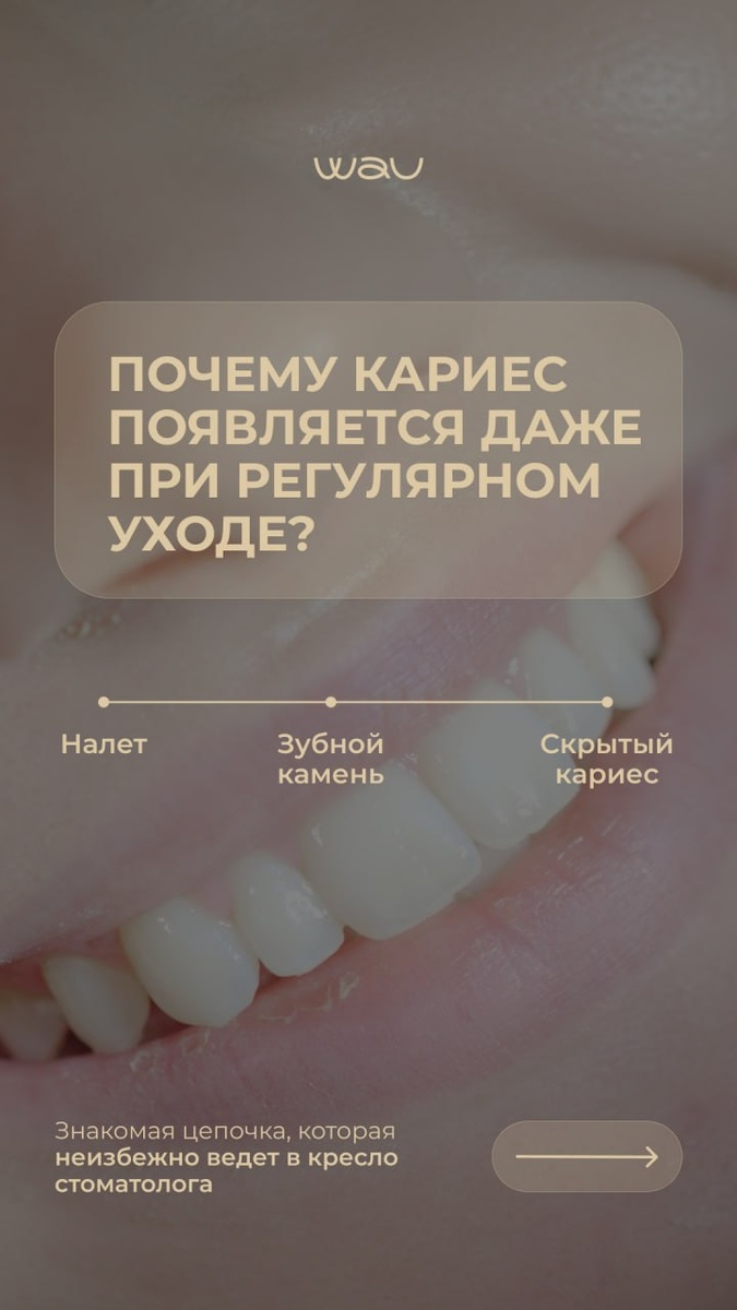 ? 🦷 Знакомая цепочка, которая неизбежно ведет в кресло стоматолога. Почему это происходит даже при регулярном уходе? Все начинается с мягкого налета. Если не вычистить его на 100%, он минерализуется и превращается в твердый зубной камень. Под ним бактерии беспрепятственно разрушают эмаль — так рождается скрытый кариес. Почему обычная щетка не справляется? - Слепые зоны: мануальная щетка не достает до узких межзубных промежутков. - Ошибки техники: хаотичные движения часто просто «втирают» налет глубже. Ваш пошаговый план защиты от WAU: 1. Звуковая щетка MORI 2.0 или MORI BLACK: звуковые колебания бережно «выбивают» налет до того, как он станет камнем. Умная 3D-карта в MORI 2.0 проследит, чтобы вы не пропустили ни одного участка. 2. Ирригатор: поток воды вымывает бактерии из десневых карманов, куда не доберется ни одна щетина. MIGA PRO — для максимальной чистоты с 9 режимами и УФ-стерилизацией. MIGA NEW — компактность и обеззараживание насадок. MIGA BLACK — портативный уход, ко